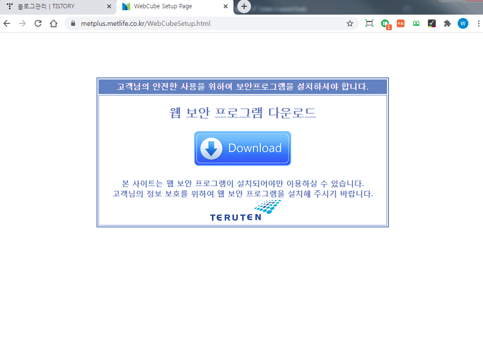 이렇게 웹보안 프로그램 다운로드 화면이 나와야 정상입니다