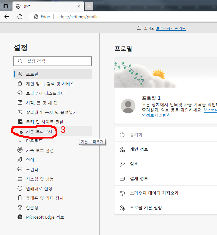 기본 브라우저를 변경하는 엣지의 설정화면입니다
