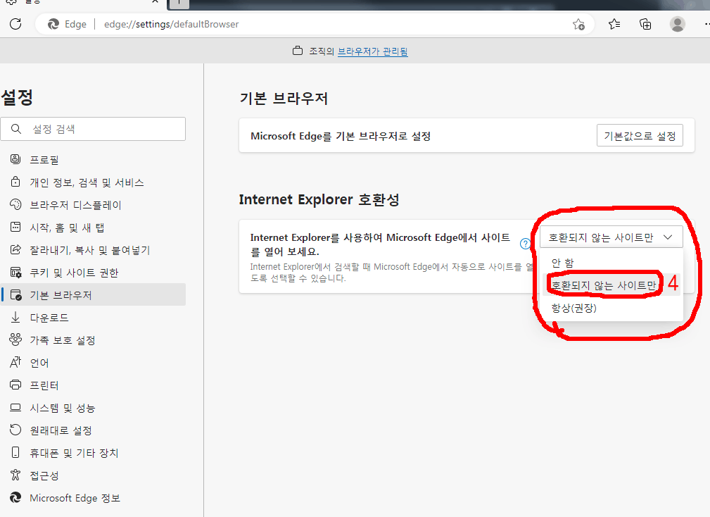 여기에서 호환되지 않는 사이트만 선택하여 주시고 엣지를 닫아주시면