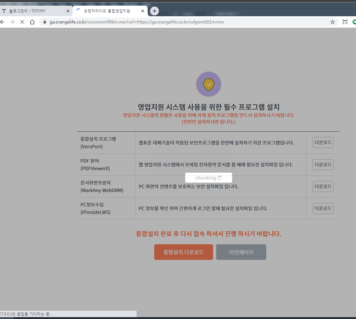 누르시면 오렌지라이프 통합 영업지원 설치페이지가 열립니다